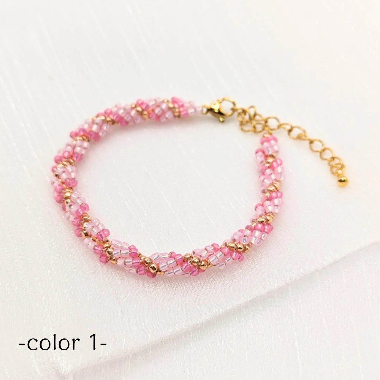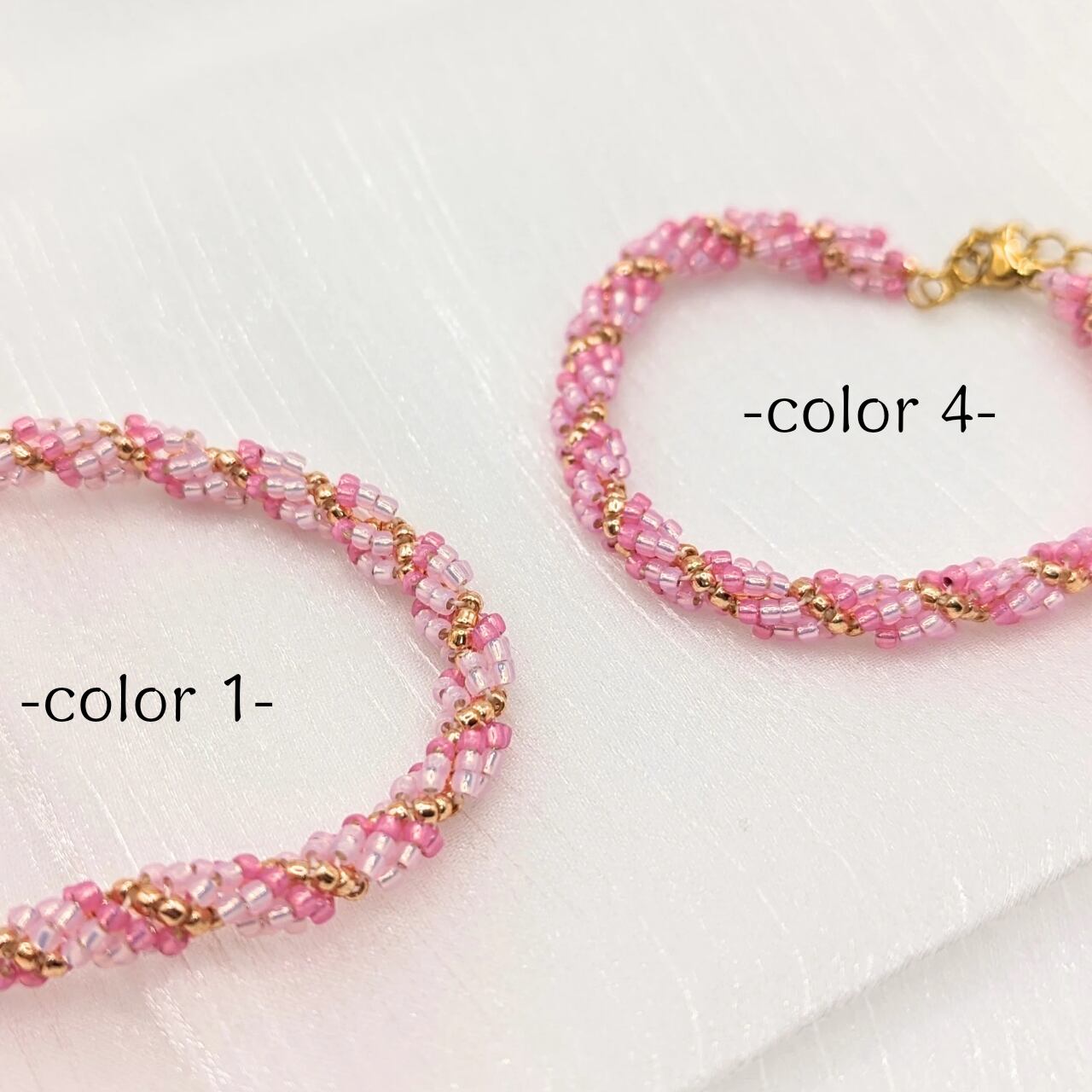 小さなビーズを「スパイラルロープ」という技法で編み込み、シンプルながらも目を引くデザインに仕上げました。