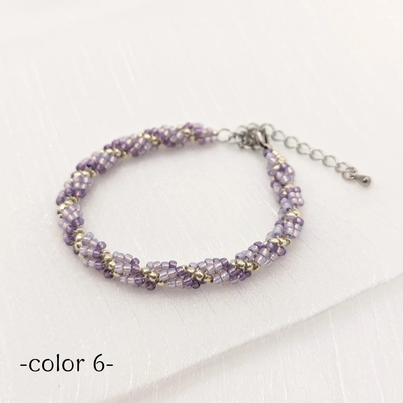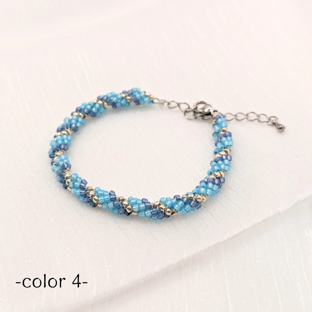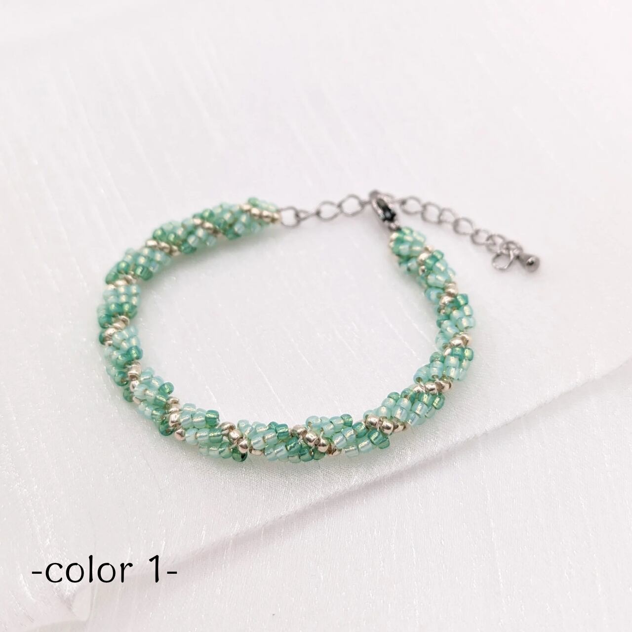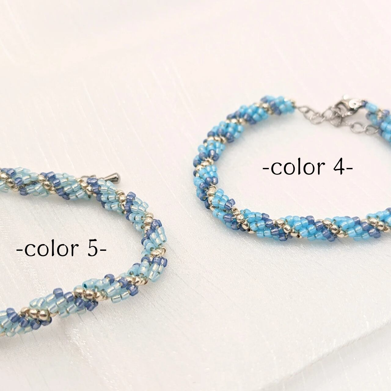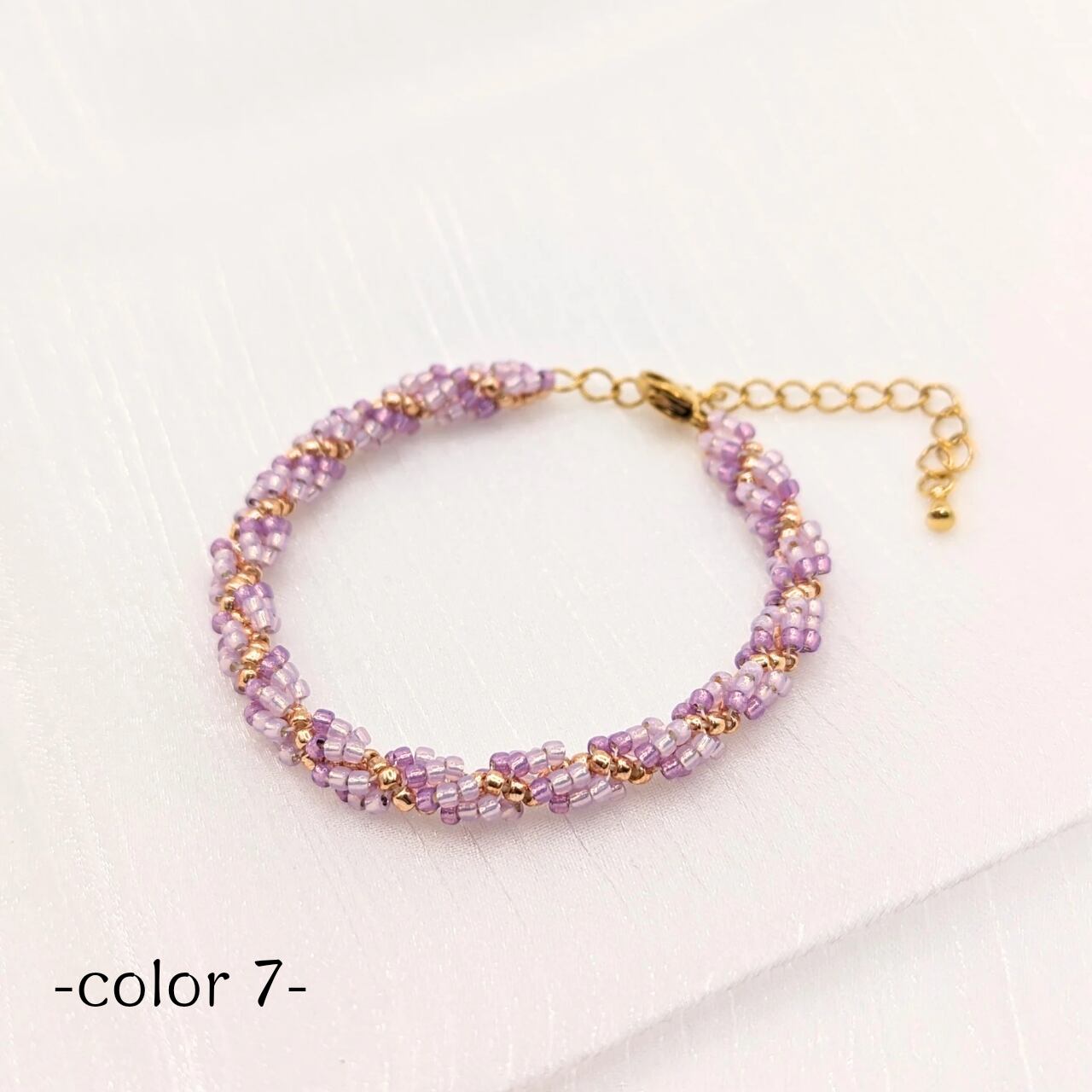 小さなビーズを「スパイラルロープ」という技法で編み込み、シンプルながらも目を引くデザインに仕上げました。
