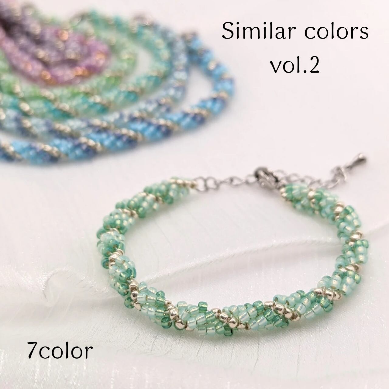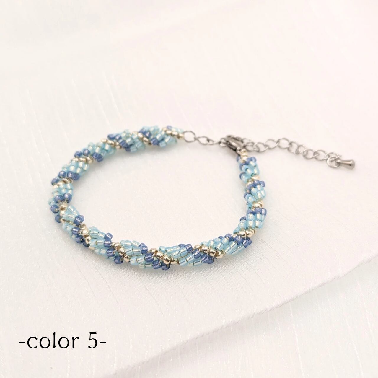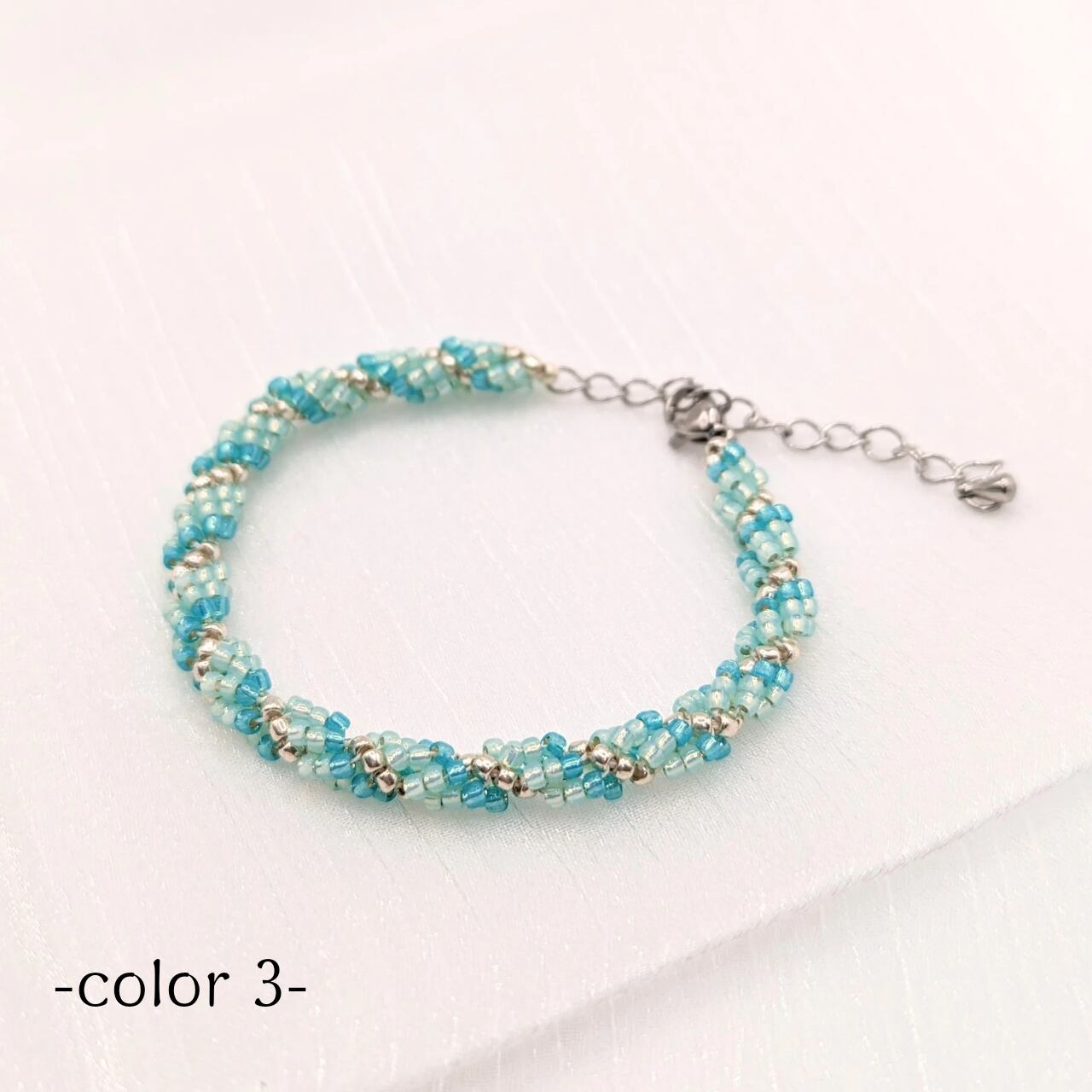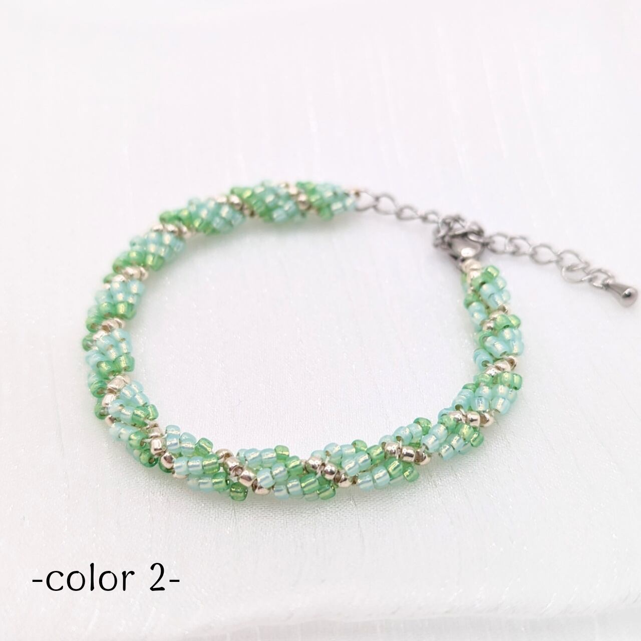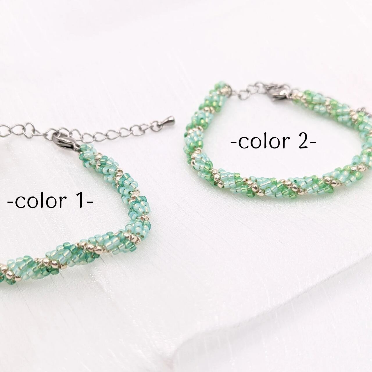 小さなビーズを「スパイラルロープ」という技法で編み込み、シンプルながらも目を引くデザインに仕上げました。