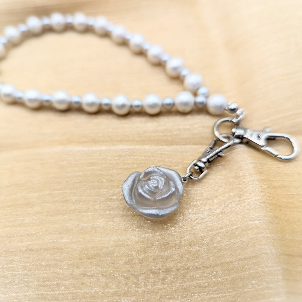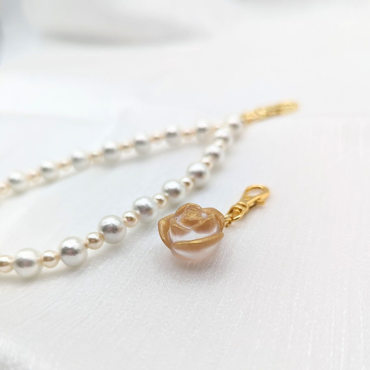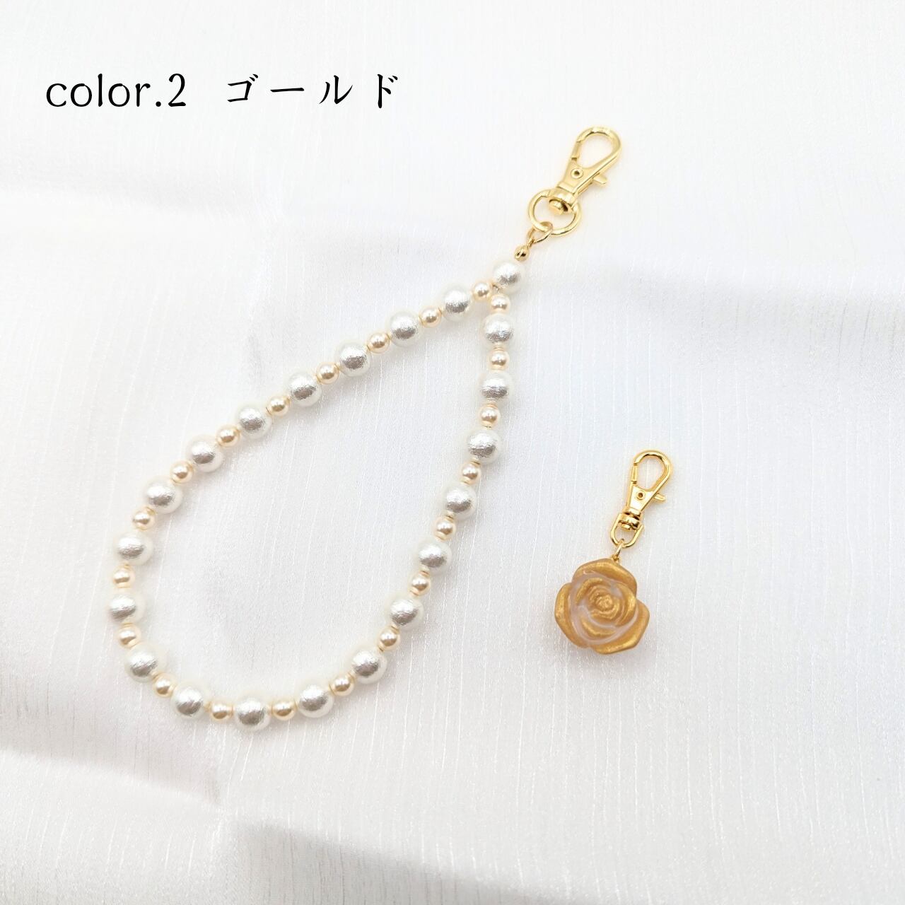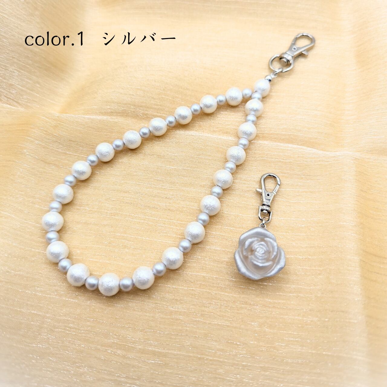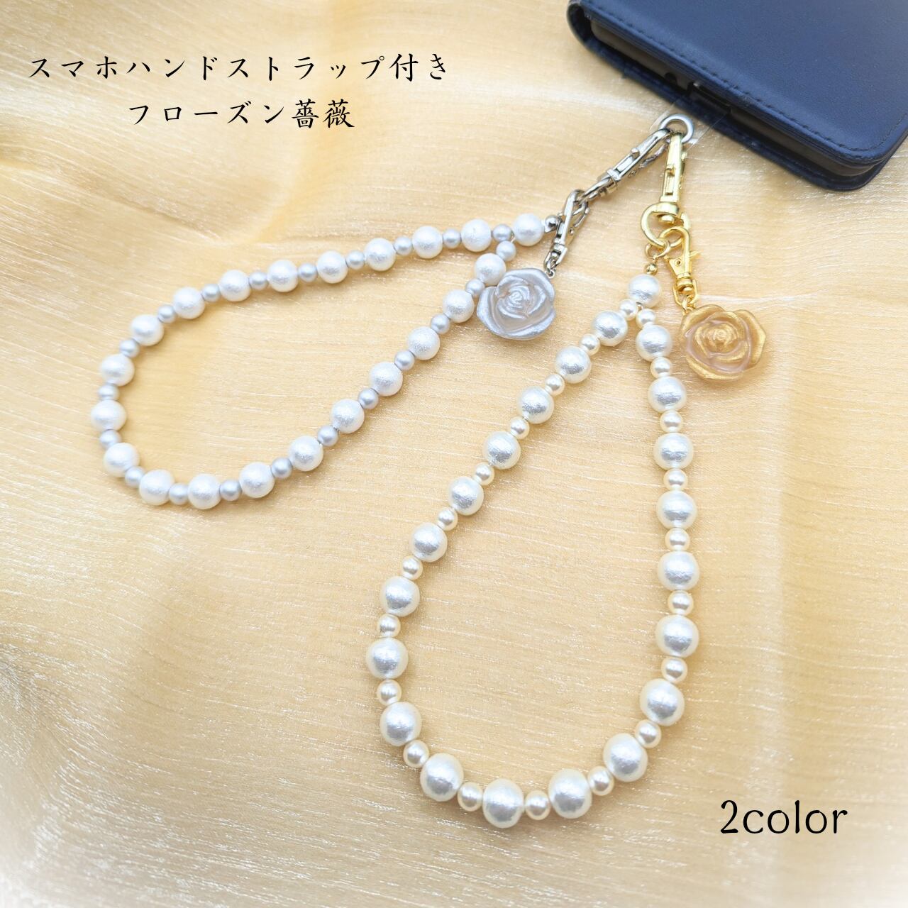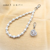 ストラップ部分はカラーごとに上品なパールビーズの色味や素材を使い分けて使用し、マット仕様のフローズン薔薇に合うシンプルなデザインにしております。